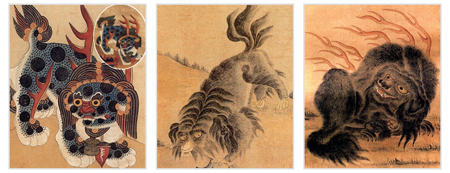 1. A Moonbae-do that was used for driving away ghosts and bringing fortune. It is still presumed that the character is a haetae that was drawn in place of a lion, but it is very likely that the character is actually a Blue Sapsaree. The beast in the painting appears to be an animal that was raised in one's house. The lower body is orange and the upper body is blue, which is the typical color of a Blue Sapsaree.